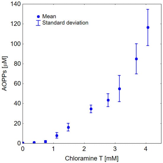 It can be seen in Figure 2 that the addition of chloramine T to HSA resulted in the formation of AOPPs. In this figure, one can also observe the exponential nature of the relationship between the level of AOPPs and the concentration of chloramine T.