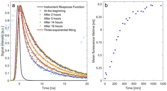 Figure 3a shows the normalized fluorescence decay curves of ALEs-HSA at 450 nm for different lengths of incubation after the addition of MDA to HSA, which was carried out at 37 °C. The decay curves were fitted to a three-exponential fluorescence model (χ2 = 1). The estimated mean fluorescence lifetime is presented in Figure 3b. The changes were observed over 15 h of incubation before equilibrium was established.