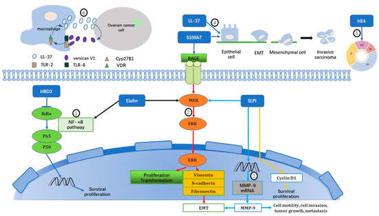Tumorigenic and pro-metastatic mechanisms of AMPs on gynecological cancers: (1) HBD3 and elafin activate NF-κB pathway [12,95]; (2) Elafin, S100A7 and SLPI induce MEK/ERK pathway [58,68,87,95,96]; (3) SLPI promotes extracellular matrix remodeling and angiogenesis [68,97]; (4) LL-37 and S100A7 induce epithelial-mesenchymal transition (EMT) [58,98]; (5) HE4 controls cell cycle [91]; (6) A vicious circle between macrophages and ovarian cancer cells by interaction between LL-37 and versican V1 [99]. MEK, Mitogen-activated protein kinases; ERK, Extracellular signal-regulated kinases; RAGE, Receptor for advanced glycation end-products; EMT, Epithelial–mesenchymal transition; VDR, vitamin D receptor; TLR, Toll-like receptor; MMP, Matrix metalloproteinases; CYP27B1, Cytochrome P450 family 27 subfamily B member 1.