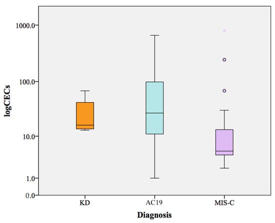 During the acute stage, the CEC median values were higher in the KD patients than in the MIS-C patients (p = 0.042). The median values of CECs in the MIS-C patients were within the normal range (1–14) reported in literature for healthy adult with the CellSearch system [,,], whereas it was higher in the KD and AC19 patients.