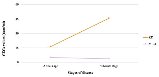 During the subacute phase, a significant increase in the CEC values of the KD patients was observed, despite the difference between the two stages not being statistically significant (p = 0.11). On the contrary, a mild decrease in CECs was detected in the MIS-C patients from the acute to subacute stage. This different trend of the CEC values between the two stages of illnesses is shown in Figure 2. In the subacute phase, the CEC levels of KD were significantly higher than those of the MIS-C patients (p = 0.01).