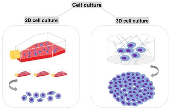 Cell culture research has a key role in scientific research including the development of imaging methods. Cell cultures enable the development of such fields of science as biotechnology, biopharmacy, or toxicology. Cell cultures are increasingly being used in pharmaceutical research for drug absorption studies and for assessing toxicity and predicting properties. The isolation and cultivation of various types of cells enables the development of various types of scientific research due to the real resemblance to a living organism. Currently, two methods of cell culture are used: two-dimensional (2D) and three-dimensional (3D) (Figure 1). In classic 2D cell culture, cells multiply in monolayers on a previously prepared medium. The 2D culture method has many limitations and does not allow for full control of cell growth and differentiation. The medium used plays an extremely important role in cell culture because it provides the cells with the necessary nutrients, growth factors, and hormones and the antibiotic content protects the cells and regulates the pH. Growth rate is usually logarithmic. To achieve this growth phase, pass the cells regularly. After the culture reaches about 80% confluence, transfer them to sterile bottles with fresh medium. In the case of divided adherent cells, after the removal of the culture medium, most often the cell layer is “trypsinized”. After washing the monolayer with, 0.9% NaCl, 0.25% EDTA trypsin solution is added in an appropriate amount. The cells are then incubated under the same conditions as used for culture after about 3.5 min under microscopic control. The cell suspension is then added to the culture medium in an appropriate volume, which, after mixing, can be transferred to new and sterile culture vessels.
