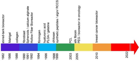 Cell cultures conducted in laboratories require special conditions: appropriate humidity, temperature, and gas concentration in the incubator must be maintained. In laboratory conditions, it is possible to control the conditions and create an optimal microenvironment for breeding. In addition, we have the option of applying active substances to breeding, such as, for example, growth factor, hormones, or proteins. In addition, cell culture should always be carried out under sterile conditions, maintaining full sterility of the room and all tools and substances used for the cultivation. The culture vessels must also be sterile and disposable. All materials used for the cell culture should be non-toxic to cells and allow for their growth and gas exchange with the environment. A 2D cell culture media can be made, for example, of polystyrene (PS) [14] or glass [15]. Growth media are used for breeding; the complete medium is most often enriched with heat-inactivated fetal bovine serum (FBS) and an antibiotic. The cultivation is normally carried out in an incubator with the following parameters: temperature 37 °C, 95% air, 5% CO2, and 100% relative humidity. The appropriate growth medium is selected depending on the cultured cell line. The 2D cell cultures ensure a low cell concentration and, moreover, do not correspond to the tumor morphology in vivo. The implementation of a 3D culture enables the reconstruction of the tumor microenvironment and the development of a procedure for conducting a 3D culture with high repeatability and preserving the tumor features and allows for the implementation of preclinical tests. The historical development of 3D breeding methods is presented in Table 1. Many physicochemical and biochemical factors influence the cells in the natural environment, which, in turn, influences the proliferation, reproduction, and development. The implementation of 3D breeding enables the re-creation of natural conditions. The 3D cultures involve many methods; for example, the use of 3D cell cultures in a bioreactor allows for an extremely high density of cells that grow in a controlled environment. These types of cultures enable high repeatability and the possibility of carrying out research, e.g., on medicinal substances. Compared to the monolayer culture, the 3D cell culture better reflects the tumor structure. In the 3D model, we have an interaction between adjacent cells and the extracellular matrix (ECM). While these interactions affect the biochemical and mechanical signals of cell physiology, there is no such interaction for cells grown in 2D. In contrast, in the case of a 3D culture, we can create an environment by mimicking in vivo conditions. With the use of 3D methods, we obtain more information about the interactions between cells: the model that creates a tumor reflects its metabolism and characteristics.