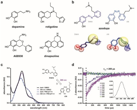 In the quest for a freely diffusible drug-like dopaminergic photoswitch, we noticed that most agonists (especially to D1 receptors, see Figure 1a) are rigid or semi-rigid, conformationally restrained structures in which essential pharmacophoric features are held in their mutual position []. Indeed, two main routes can be identified in the early development of dopamine agonists, namely, the rigidification of the dopamine molecule and the dissection of apomorphine, one of the first potent dopamine agonists to be found []. Dopamine rigidification led to the discovery of potent agonists, whereas the apomorphine de-rigidification generally reduced its efficacy [,]. It stands then to reason that governing the geometry of such structures would enable the control of their biological effects. This could be achieved by “building” upon a semi-rigid and photoisomerizable molecular frame the structural elements required for DAR activation and using light as external control signal. This approach can be likened to a “photoswitch decoration”, in which pharmacophore groups are introduced into the structure of a molecular photoswitch to design a light-controlled bioactive compound. Common features in the dopamine agonist pharmacophore model are the following: (I) a cationic site point (an amino group) that forms a salt bridge with an aspartic acid residue in the receptor’s third transmembrane helix (TM3); (II) one or two hydrogen bond acceptor/donor sites (e.g., hydroxy groups), that interact with serine residues in TM5; and (III) an aromatic ring system that takes part in π–π interactions with hydrophobic residues in TM6 [,,]. On these grounds, we devised a photoswitchable dopamine agonist by decorating an azobenzene molecule with two hydroxyl substituents (II) on one phenyl ring, and an amino group (I) connected through a short linker to the other phenyl ring (III) (Figure 1b). This molecule, that we named azodopa, carries the main DAR binding determinants and enables to change their relative position upon photoisomerization (Figure 1b). Azodopa was synthesized in two steps via an azo-coupling reaction between commercially available 2-(2-(dimethylamino)ethyl)aniline and 1,2-dihydroxybenzene (see supplementary Scheme S1 and Supplementary Materials, SM, for detailed synthetic procedures and physicochemical characterization).