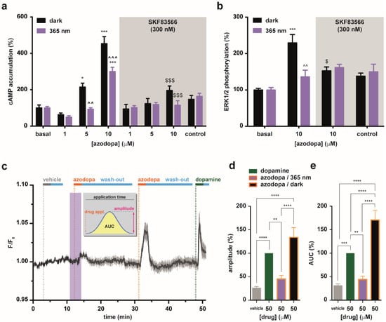 In vitro pharmacological characterization of azodopa. (a) Effect on D1-mediated adenylyl cyclase activation. cAMP accumulation experiments in HEK-293T cells transiently transfected with D1 and treated with different concentrations of azodopa, in the dark (black bars) or under illumination (purple bars), in the presence (gray area) or not (white area) of a D1-like receptor antagonist (SKF83566). Values are represented in percentage vs. basal levels of cAMP. Data are mean ± S.E.M. (6 experiments performed in quadruplicate). Statistical differences were analyzed by two-way ANOVA followed by Tukey’s post hoc test (*** p < 0.001 vs. basal; * p < 0.05 vs. basal; ^^^ p < 0.001 vs. dark; ^^ p < 0.01 vs. dark; $$$ p < 0.001 vs. controls non-pretreated with the antagonist). (b) Effect on D1-mediated ERK1/2 activation. ERK1/2 phosphorylation was determined in HEK-293T cells transiently transfected with D1 and treated with different concentrations of azodopa, in the dark (black bars) or under illumination (purple bars), in the presence (gray area) or not (white area) of a D1-like antagonist (SKF83566). Values are represented in percentage vs. basal levels of ERK1/2 phosphorylation. Data are mean ± S.E.M. (3 or 4 experiments performed in triplicate or quadruplicate). Statistical differences were analyzed by two-way ANOVA followed by Tukey’s post hoc test (*** p < 0.001 vs. basal; ^^ p < 0.01 vs. dark; $ p < 0.05 vs. controls non-pretreated with the antagonist). (c–e) Effect on D1-mediated intracellular calcium release compared to dopamine. (c) Real-time calcium imaging response (averaged traces, black line, n = 24 cells) in HEK-293T cells co-expressing D1 receptors and R-GECO1 as calcium indicator. Traces were recorded upon direct application of azodopa (50 µM, orange bars) in the dark (white area) and under illumination (purple area). Shadow represents “± S.E.M.”. Gray and green bars indicate the application of vehicle (control) and dopamine (reference agonist), respectively. Light blue bars indicate wash-out periods. See example frames and raw data traces of individual cells in supplementary Figure S10, and supplementary Video S1 for the entire movie. Two values of the calcium responses generated by azodopa were calculated (Origin 8 software) and compared: the peak amplitude ΔF/F0 (d), calculated as the difference between the maximal and the minimal intensity of each response (**** p < 0.0001 for vehicle vs. dopamine; **** p < 0.0001 for vehicle vs. azodopa/dark; **** p < 0.0001 for azodopa/365 nm vs. azodopa/dark; ** p = 0.035 for dopamine vs. azodopa/365 nm), and the area under the curve (AUC) (e), calculated as the integral over the entire application time of vehicle or drugs (**** p < 0.0001 vehicle vs. dopamine; **** p < 0.0001 for vehicle vs. azodopa/dark; **** p < 0.0001 for dopamine vs. azodopa dark; **** p < 0.0001 for azodopa/365 nm vs. azodopa/dark; *** p = 0.001 for vehicle vs. dopamine; ** p = 0.0025 for dopamine vs. azodopa/365 nm). Data are mean ± S.E.M. (n = 40 cells from 3 independent experiments). Data were normalized over the maximum response obtained with the saturating concentration of dopamine (50 μM) and were analyzed by one-way ANOVA followed by Tukey’s post hoc test for statistical significance. All statistical analyses (panels (a,b,d,e)) were performed with GraphPad Prism 6.