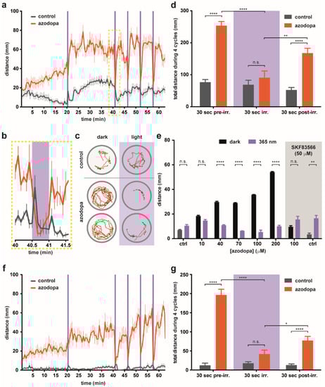 The promising photopharmacological profile of azodopa prompted to use it in vivo to modulate dopaminergic neurotransmission. For that purpose, we designed a behavioral assay to record and quantify the locomotor activity of living animals as a function of drug concentration and illumination. It is known that dopamine plays a pivotal role in motor control in humans, as it activates striatal direct pathway neurons that directly project to the output nuclei of the basal ganglia through D1 receptors, whereas it inhibits striatal indirect pathway neurons that project to the external pallidum through D2 receptors []. We chose zebrafish larvae (Danio rerio) as animal model for our experiments because of their transparency, which facilitates the delivery of light, and their morphological, genetic, and behavioral similarity to higher vertebrates [,,,,,,]. Indeed, a functional nervous system is established after only 4–5 days of embryonic development in zebrafish, enabling them to perform complex behaviors such as swimming and exploratory activity. In particular, the major dopaminergic pathways in mammals are also represented in the zebrafish brain, and homologous receptors for most of the mammalian subtypes have been identified in these animals. Humans and zebrafish share 100% of the amino acids in the binding site for D1 and D3 receptors, and 85–95% for D2 and D4 receptors, and generally similar effects are observed for dopaminergic ligands in zebrafish and in mammals []. As a rule of thumb, dopamine receptor agonists increase the locomotor activity, whereas antagonists decrease it []. However, disentangling the action of drugs on the multiple components of dopaminergic transmission (including different brain regions [], the regulation of retinal function [], and of circadian rhythms []) constitutes an unmet need of pharmacology and medicine. Therefore, we set to test azodopa in vivo and to take advantage of photocontrolling dopaminergic responses.