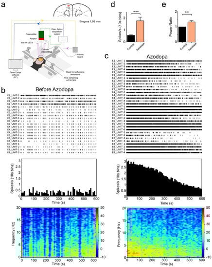 We studied whether azodopa modulates neural activity in the cortex of mice. For such experiments, we developed a custom setup that combined in vivo electrophysiological recordings and the possibility to illuminate with 365 nm LEDs. The Open Ephys data acquisition system was used to record neural activity via an octrode (four two-wire stereotrode array) inserted in the superficial layers of the secondary motor cortex (M2) with a large craniotomy that allowed exposure of cortical tissue (Figure 4a).
