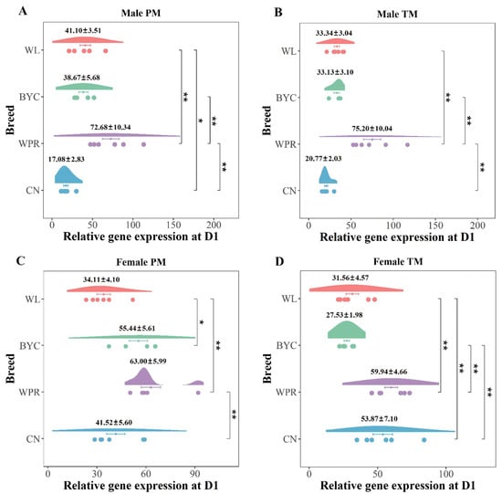 2.3. Various Gene Expression of MYOD among the Four Chicken Breeds at D1