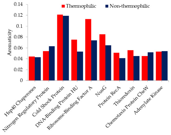 Moreover, we also used aromaticity values to analyze aromatic AAs in thermophilic and non-thermophilic proteins. Aromaticity is the relative frequency of aromatic AAs [56]. Figure 2 shows the aromaticity value of thermophilic proteins and their non-thermophilic orthologous. As the figure shows, except for nitrogen regulatory protein, thioredoxin, and chemotaxis protein CheW, most of the thermophilic proteins have high aromaticity, which indicates that aromatic AAs are preferred in thermophilic proteins. Aromatic AAs form stable aromatic interactions, which contribute to thermal stability. Anderson et al. and Serrano et al. [57,58] have reported that a pair of aromatic interactions contribute 0.5 to 1.4 kcal/mol energy, which means that the increase in aromaticity in thermophilic proteins helps to endow proteins with thermal stability. It is also confirmed by protein engineering methods that the introduction of aromatic clusters on the surface of protein can improve stability in the protein. Kannan et al. [59] have analyzed aromatic clusters in 26 thermophilic proteins and their non-thermophilic orthologous. They found that thermophilic proteins have higher aromatic clusters. These aromatic clusters were able to produce pairwise interactions, which may be crucial to hinder the thermal denaturation of the protein structure.