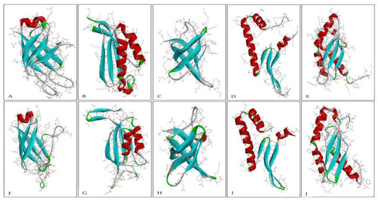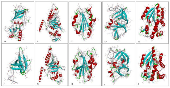 The secondary structure is a folded structure formed by hydrogen bonds between partially positive hydrogen atoms and partially negative nitrogen atoms in the backbone [60,61,62]. Common secondary structure elements include coil, helix, sheet, and turn. The secondary structures of all 10 pairs of proteins are shown in Figure 3 and Figure 4, and their percentage is represented in Table 1.