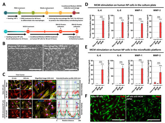Effects of soluble factors on the culture medium of macrophage THP-1 cells on human NP cells. (A) Schematic of experimental timeline for MCM production of and paracrine effect replication on human NP cells stimulated by MCM. (B) The images show that human monocyte THP-1 cells differentiate into activated THP-1 macrophages cells upon PMA treatment for 48 h (scale bar = 400 μm). (C) MCM stimulation on human NP cells for degenerative IVD conditions. Fluorescence image and quantification of fluorescence intensity of NF-κB p65 in human NP cells stimulated by MCM are shown. The NF-κB p65 protein is preferentially distributed in the nucleus rather than the cytoplasm (red arrow). This can induce degenerative conditions in human NP cells as the p65 protein acts as a transcription factor (scale bar = 125 μm). (D) The results show that MCM-exposed human NP cells produce inflammatory mediators and ECM-modifying enzymes compared to naïve NP cells or MCM, in both conventional culture plates and (E) our microfluidic platform. (F) Assessment of human NP cytotoxicity with/without MCM using a live/dead assay. MCM-cultured human NP cells did not exhibit any difference in cell cytotoxicity compared with naïve NP cells (scale bar = 400 μm). *** p < 0.001 as compared with naïve NP cells. The line indicates comparison with each group.