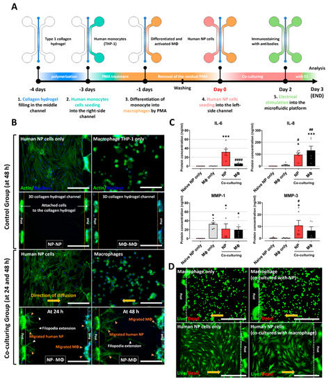 Interaction between human NP cells and macrophage THP-1 cells on the microfluidic platform. (A) Schematic of experimental setup and timeline on the microfluidic platform. (B) Significant migration of human NP cells and macrophage THP−1 cells (NP−MΦ group) is observed in the central collagen hydrogel channels at culture times of 24 and 48 h (orange arrowhead), whereas the control groups (NP−NP or MΦ−MΦ) did not exhibit any difference in the migration properties at a culture time of 48 h. In addition, the human NP cells show directional extension of filopodia (white arrowhead), which are the leading edge of lamellipodia in migrating cells, from human NP cells toward the macrophage channel (scale bar = 400 μm). (C) Protein production in human NP cells and macrophages on the microfluidic platform. The coculturing groups show higher protein production due to inflammatory mediators and ECM-modifying enzymes than naïve NP cells or naïve macrophages. (D) Assessment of human NP or macrophage cytotoxicity on the microfluidic platform using a live/dead assay. Both human NP cells and macrophages did not show any difference in cell cytotoxicity compared with naïve NP cells or naïve macrophages (scale bar = 400 μm). * p < 0.05, and *** p < 0.001 as compared to naïve NP cells. # p < 0.05, ## p < 0.01, and #### p < 0.0001 as compared to naïve macrophages. Each dot represents the mean of six samples in an independent experiment.