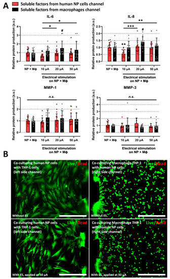 Effects of electrical stimulation on the microfluidic platform under coculturing conditions. (A) Protein production in human NP cells and macrophages with/without ES on the microfluidic platform. The ES, applied at 10 μA, inhibits the protein production of inflammatory mediators such as IL-6 and IL-8 in degenerative human NP cells. (B) Assessment of human NP or macrophage cytotoxicity with/without ES applied at 50 μA on the microfluidic platform using a live/dead assay. 50 μA is the maximum dose used in this study. The cells did not show a difference in cell cytotoxicity (scale bar = 400 μm). * p < 0.05, ** p < 0.01, *** p < 0.001, and n.s., no significant difference, as compared with human NP cells cocultured with macrophages. # p < 0.05 as compared with macrophages cocultured with human NP cells. The line indicates the comparison with each group. Each dot represents the mean of six samples in an independent experiment.