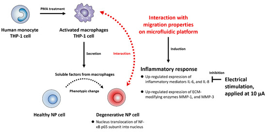 We propose an interaction between human NP and macrophages in an in vitro model and examine the effects of ES in degenerative IVD conditions using a microfluidic electroceutical platform. This can mimic the immune response expected to occur during the development of IVD degeneration in the human body. Our results suggest that the biological interactions between human NP cells and infiltrating macrophages lead to increasingly severe inflammatory conditions, and a better understanding of these interactions provides therapeutic target molecules of IVD degeneration for the application of ES. In addition, our platform provides a reliable system to study pathomechanisms in diverse diseases induced by cell-to-cell interplay and to assess the effects of ES in a 3D microenvironment.