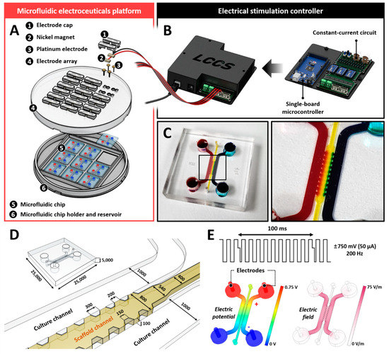 Microfluidic electroceuticals platform. (A) The microfluidic electroceuticals platform comprises two major units: an electrical stimulation controller and a microfluidic chip array. (B) The electrical stimulation controller regulates the micro-current strength. The output microcurrent strength in the microfluidic platform is in the range of 0−50 μA. The output timing of the current can be adjusted using the microcontroller. The internal circuit, combined with the controller, was developed to maintain a constant current during the cell culture process. (C) The microfluidic chips were fabricated using standard lithography. They comprise of two distinct cell culture chambers connected through a collagen type 1 hydrogel channel for various reagents or soluble factors derived from cells to diffuse. (D) Schematic and extended view of the microfluidic chips. (E) The electric field within the channel was applied at the biphasic signals (±750 mV, 50 µA, 200 Hz), which constitute the maximum dose of electrical stimulation used in this study. Simulation images show electric potential formation or field differences. All scales are represented in μm.