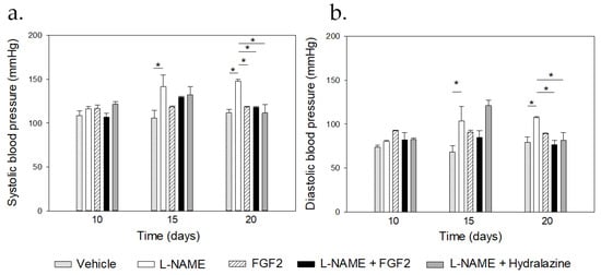 - Martinez-Fierro, M.L.; Hernadez-Delgadillo, G.P.; Flores-Mendoza, J.F.; Alvarez-Zuniga, C.D.; Diaz-Lozano, M.L.; Delgado-Enciso, I.; Romero-Diaz, V.J.; Lopez-Saucedo, A.; Rodriguez-Sanchez, I.P.; Marino-Martinez, I.A.; et al. Fibroblast Growth Factor Type 2 (FGF2) Administration Attenuated the Clinical Manifestations of Preeclampsia in a Murine Model Induced by L-NAME. Front. Pharmacol. 2021, 12, 663044. [Google Scholar] [CrossRef] [PubMed]