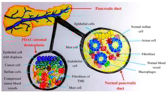 In the periphery of PDAC, tumor-associated macrophages are accumulated, being correlated with a M2 phenotype. This type of phenotype is characterized by extra-pancreatic and lymph vessel invasion, lymph node involvement, and shortened survival time []. The adipose tissue may also contribute to PC development via adipocytes, immune cells, endothelial cells, fibroblasts, stem cells, or progenitor cells []. Many of these cells can secrete pro-inflammatory cytokines (TNF-α, IL-6, leptin, TGF-β), which are known to be involved in cancer proliferation [].