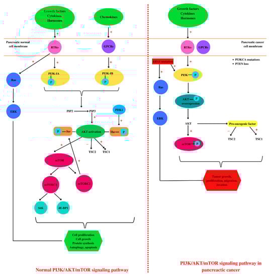 Pancreatic PI3K/AKT/mTOR: normal versus pathological. In a healthy cell, such as a pancreatic cell, different ligands (growth factors, hormones, cytokines, or chemokines) bind to tyrosine kinase (RTKs) or G-protein receptors (GPCRs) located in the cell membrane, leading to PI3K activation by phosphorylation. Further, PI3K catalyzes the phosphorylation of phosphatidylinositol 4,5-bisphosphate (PIP2) at phosphatidylinositol 3,4,5-trisphosphate (PIP3), leading to AKT activation. AKT activation consists of two phosphorylation processes, one performed by mammalian target of rapamycin complex 2 (mTORC2) at serine 473 residue and the second one at threonine 308 residue performed by phosphoinositide-dependent kinase 1 (PDK1). Phosphorylated AKT induces further activation of mTOR and tuberous sclerosis protein 1 (TSC1) and TSC2 inhibition. In addition, mTOR phosphorylates ribosomal protein S6 kinases (S6K) and 4E-binding protein 1 (4E-BP1). The binding of growth factors to RTKs leads to Ras activation and in the end to extracellular signal-regulated kinase (ERK) activation, correlated with cell proliferation. Altogether, ERK and AKT activation are conducive to cell growth, proliferation, protein synthesis, autophagy, and apoptosis. In pancreatic cancer cells, besides growth factors, hormones, and cytokines, KRAS mutations activate PI3K and Ras. Moreover, these types of cells are characterized by PIK3CA mutations and PTEN loss. All these molecular events are associated with an overexpression of AKT phosphorylation, regarded as a pro-oncogenic factor. Together with ERK, AKT induces tumor growth, proliferation, migration, and invasion. “+”: activates, “−”: inhibits.