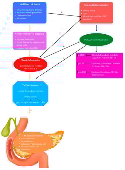 Pancreatic cancer pathogenesis: The pathogenesis of PC involves non- and modifiable risk factors that induce chronic inflammation mediated by several cell types. Chronic inflammation mediates TME development characterized by stromal desmoplastic reaction—the main PC histological hallmark, leading to fibrotic stoma formation, rich in type I collagen, fibronectin, and hyaluronic acid (HA). KRAS mutations may be activated by inflammation and modifiable risk factors such as diet and diabetes mellitus. Chronic inflammation and KRAS mutations are the main actors that induce PI3K/AKT/mTOR activation, contributing to PC-TME development, correlated with increased phosphorylated levels. Currently, the mentioned PI3K/AKT/mTOR inhibitors have been used in clinical studies. “+” activates.