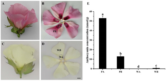 The color phenotypes characterization and total anthocyanin content of different parts of petals of varieties XinLuZao 74 (X74) and Pink Flower (PF). (A,B) Phenotypes of PF mutant petals. (C,D) Phenotypes of X74 petals. (E) Total anthocyanin concentration in different regions of X74 and PF petals. All data are shown as mean ± SE (n = 3). Different letters represented statistically significant differences (one-way ANOVA, p < 0.05). Scale bar: 1 cm. PA, PB, WA, and WB represent the spot region and non-spot region of PF and X74 petals, respectively.