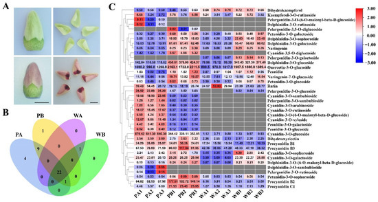Phenotypes of XinLuZao 74 (X74) and Pink Flower (PF), and preliminary analysis of metabolomics data. (A) Sampling period for metabolite analysis and RNA-sequencing (RNA-Seq) analysis. Scale bar: 1 cm. (B) Venn diagram of metabolites accumulated in different regions of petals of X74 and PF. (C) Cluster heat map of the 38 anthocyanin metabolites in the X74 and PF cultivars. Intensity values were adjusted by log transformation and then normalized. PA, PB, WA, and WB represent the spot region and non-spot region of PF and X74 petals, respectively. PA1/PA2/PA3, PB1/PB2/PB3, WA1/WA2/WA3, and WB1/WB2/WB3 represents three biological replicates for each sample, respectively.