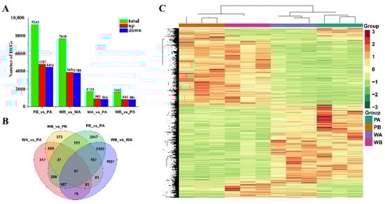Differential genes (DEGs) analysis of petals of different colors and regions. (A) Numbers of DEGs in pairwise comparisons of the four libraries. (B) Venn diagram showing DEG distributions. (C) Expression profile clustering of different samples. The color scale on the right represents re-processed log10 (FPKM+1) using heatmap, representing the relative expression level. The expression variance for each gene is indicated by different colors ranging from low (green) to high (red). PA, PB, WA, and WB represent the spot region and non-spot region of PF and X74 petals, respectively.