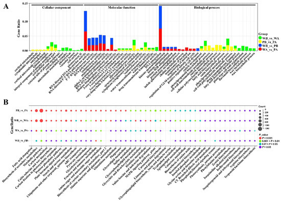 We assigned all the DEGs of different comparison groups to three major GO categories, including cellular components (CC), molecular functions (MF), and biological processes (BP) (Table S4). The top CC sub-categories in WB_vs._WA and PB_vs._PA were ‘integral component of plasma membrane’, ‘kinesin complex’, and ‘extracellular region part’. The DEGs in WA_vs._PA and WB_vs._PB were not significantly enriched in CC terms (Figure 4A and Table S4). Of the MF categories, ‘DNA/RNA polymerase activity’, ‘endonuclease activity’, and ‘ribonuclease activity’ were found to be enriched in WA_vs._PA and WB_vs._PB. The DEGs from WB_vs._WA and PB_vs._PA were enriched with ‘CoA synthase activity’, ‘transporter activity’, and ‘glycosyl transferase activity’. The BP terms of ‘DNA integration’, ‘histone ubiquitination’, and ‘regulation of cell division’ were enriched in WA_vs._PA and WB_vs._PB comparisons (Figure 4A and Table S4). The GO terms ‘cuticle development’, ‘phenylpropanoid biosynthetic process’, and ‘drug transmembrane transport’ were the top ones in WB_vs._WA and PB_vs._PA comparisons. In addition, genes associated with sugar metabolic, starch metabolic, lignin, flavonoid, and sterol biosynthetic process were also found to be enriched in WB_vs._WA and PB_vs._PA (Table S4).