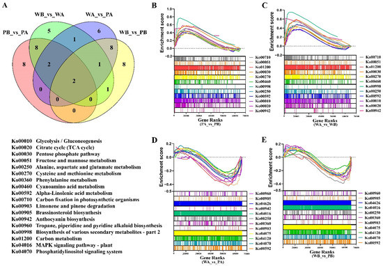 Gene set enrichment analysis (GSEA) was performed in four different comparison groups. (A) Venn diagram shows the distribution of the top20 enriched gene sets from four comparison groups (PA_vs._PB, WA_vs._WB, WA_vs._PA, and WB_vs._PB). (B,C) Represents the overlapping enriched gene sets from GSEA, comparing spot with non-spot of petals of PF or X74 (PA_vs._PB and WA_vs._WB). (D,E) Represents the overlapping enriched gene sets from GSEA comparing PF petals colored with X74 petals colorless regions of spot or non-spot. (WA_vs._PA and WB_vs._PB). PA, PB, WA, and WB represent the spot region and non-spot region of PF and X74 petals, respectively.