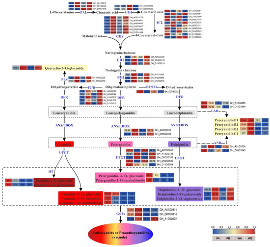 To explore the molecular mechanism related to the pink coloration of the PF petals, we performed RNA-seq using samples collected from the WA, WB, PA, and PB regions (Figure 1B,D and Figure 2A). Clean reads were obtained after filtering out low-quality reads. The Q20 and Q30 of each sample were greater than 97.4% and 92.63%, respectively. The GC content of the reads was 42.97–43.42%. Between 96.54% and 97.04% of the clean reads were mapped to the upland cotton genome (Gossypium hirsutum, ZJU-improved_v2.1_a1). Among the mapped reads, the uniquely mapped reads accounted for 92.06–92.95% (Table S3). The Pearson correlation coefficient and principal component analysis of the samples based on the FPKM (fragments per kilobase of transcript per million mapped reads) values showed that the biological replicates exhibited similar expression patterns, indicating the high reliability of the sequencing data (Figure S2). To further confirm the accuracy of the transcriptomic data, we selected 11 differentially expressed genes of the anthocyanin biosynthesis pathway for qRT-PCR verification. Although there were slight differences between the results of the RNA-seq and qRT-PCR, the overall trend was consistent (Figure S3).