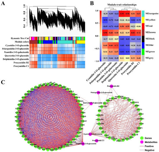 Weighted gene co-expression network analysis (WGCNA) of DEGs (with 7 metabolites, |PCC| ≥ 0.95) identified in pink and white petals. (A) Hierarchical clustering tree (cluster dendrogram) results showed eight expression modules, labeled with different colors. (B) Module–anthocyanin relationship analysis. The value inside each box represents Pearson’s correlation coefficient between the module with anthocyanin. The color scale on the left represents the degree of correlation between modules and anthocyanins and the red represent high correlation. (C) Connection network between DEGs and anthocyanin metabolites; the green ellipsoid represents DEGs; the pink diamond represents the metabolites. The red line indicates a positive correlation, and the blue dotted line indicates a negative correlation.