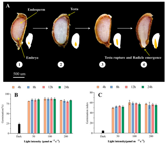 White light was used as the light source in all germination experiments, and the light intensity was 50 μmol m−2 s−1, 100 μmol m−2 s−1, 200 μmol m−2 s−1, photoperiod was 4 h, 8 h, 16, 24 h, and full dark treatment, respectively. The spectrum chart is shown in Supplementary Figure S1. Gibberellin, abscisic acid, paclobutrazol, and fluridone used in the germination experiment in Figure 5 were all dissolved by 0.1% DMSO, and it was verified that 0.1% DMSO had no significant difference in seed germination compared with water (Figure S2). All germination experiments were performed with 50 seeds per replicate. All germination experiments were observed for 20 days. All germination experiments were repeated three times. The germination index was calculated by the following equation [43]: