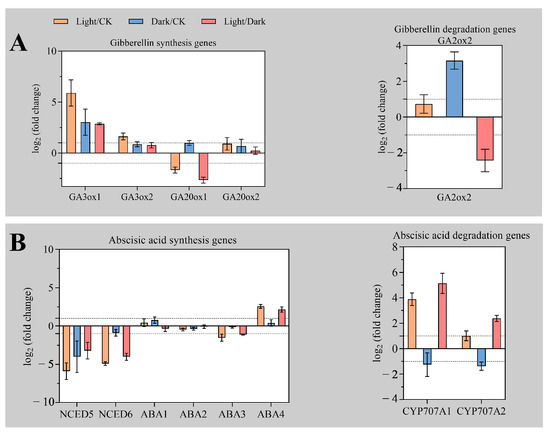 The content of GA is affected by both the synthesis and degradation genes. In this study, it was found that GA3ox1, GA3ox2, GA20ox1, and GA20ox2 genes were up-regulated in “Light/CK”, “Dark/CK”, and “Light/Dark”. The log2 (fold change) of GA3ox1 in “Light/CK” and “Light/Dark” was 5.9 and 2.87, respectively. Therefore, it is speculated that GA synthesis is more intense under light (Figure 3A). GA2ox2 is responsible for the degradation of active GA. This gene was slightly up-regulated in “Light/CK” and significantly down-regulated in “Light/Dark”, but markedly up-regulated in “Dark/CK”. This indicates that compared with dark, the synthesis of GA is activated under light, while the degradation of GA is inhibited (Figure 3A).