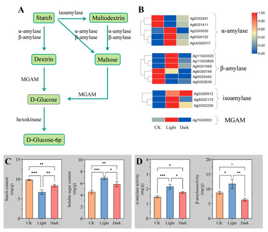 During seed germination, embryo growth mainly depends on starch decomposition and glucose metabolism for energy and carbon skeletons. The starch decomposition process is shown in Figure 5A [20]. Amylase mainly consists of α-amylase and β-amylase, which are involved in the decomposition process of starch to maltodextrin, maltose, and dextrin [21]. In addition, isoamylase and maltase–glucoamylase (MGAM) are also involved in starch decomposition. In this study, all or most of the encoding genes of several enzymes were appreciably up-regulated under light (Figure 5B). Therefore, we also measured the contents of starch and soluble sugar under different conditions. The results showed that compared with CK, the starch content in dark decreased markedly, while the soluble sugar content increased significantly. Under light, starch content markedly decreased compared with CK and dark, while soluble sugar content increased significantly (Figure 5C). Consistent with a decline in starch content, the activity of α-amylase and β-amylase was strongly increased under light (Figure 5D). These results indicated that light improved the sugar supply capacity of celery seed and provided sufficient energy for embryo growth.