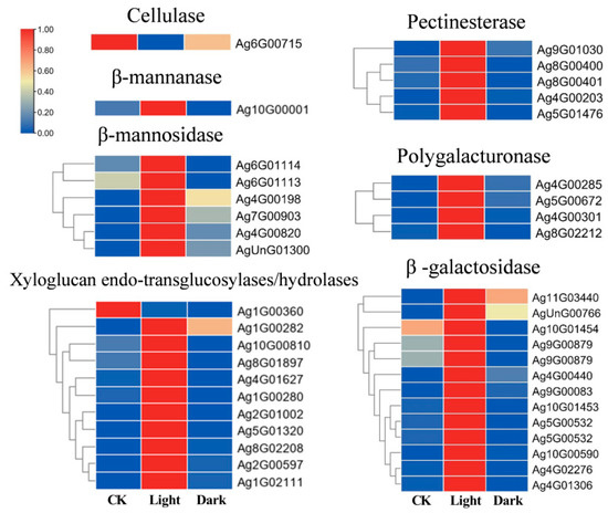 It is generally believed that the enzymatic reaction mechanism of endosperm weakening, namely cell wall remodeling enzymes (CWREs), may play an important role in the endosperm weakening process of seed germination. The cell walls of higher plants are composed of cellulose, pectin, and hemicellulose [22]. Enzymes that degrade these cell wall polysaccharides may all play a role in endosperm weakening. Among them, hemicellulose degradation enzymes include xyloglucan endoglycosylase/hydrolase (EC2.4.1.207/3.2.1.151), β-mannanase (EC3.2.1.78), and β-mannoidase (EC3.2.1.25); pectin-degrading enzymes include pectin methyl esterase (EC3.1.1.11), polygalacturonase (EC3.2.1.15), and β-galactosidase (EC3.2.1.23); and cellulose-degrading enzyme identified to cellulase (EC3.2.1.4). The results showed that, compared with CK and dark, all or most of the genes of cell wall remodeling enzymes except cellulase were appreciably up-regulated under light, suggesting that multiple cell wall remodeling enzymes may play a synergic role in endosperm weakening of celery seed (Figure 6).