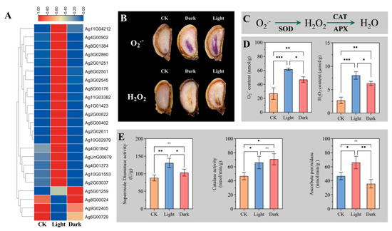 To observe the site of ROS biosynthesis, the production and accumulation of O2·– were investigated by histochemical NBT staining. The results showed that the whole embryos of CK, light, and dark were stained at the same time, and the degree of staining was relatively uniform. The production and accumulation of H2O2 were investigated by performing DAB staining, and it was found that CK was not easily stained, dark was slightly stained, and light was more easily stained at the radicle. To further study the role of ROS, the content of O2·– and H2O2 was measured. Compared with CK and dark, the contents of two kinds of ROS in light were significantly increased (Figure 7D). The results shown above suggest that light can promote the production of ROS, and H2O2 may play a more important role in endosperm weakening.