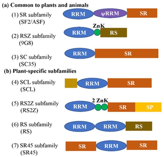 In eukaryotes, genes undergo pre-mRNA splicing, post-splicing, and translation from DNA to mature protein. A family of proteins called serine/arginine-rich (SR) proteins are the most extensively studied in animals and to a lesser extent in plants. They play an important role as non-snRNP proteins [1]. The SR protein family comprises a number of phylogenetically conserved and structurally related proteins with a characteristic domain rich in arginine and serine residues, known as the RS domain. Manley and Krainer defined an SR protein as any protein with the following minimal attributes: one or two N-terminal RBDs (PF00076), followed by a downstream RS domain of at least 50 amino acids with >40% RS content, characterized by consecutive RS or SR repeats [2]. In metazoans, the new nomenclature is based on the root “SRSF” (SR splicing factor) followed by numbers. In the plant SR protein community, a standard nomenclature is used (Figure 1). The family of serine/arginine-rich proteins (SR proteins), as a type of splicing factor, has recently attracted attention in plants. The SR proteins form a complex network by interacting with small nuclear ribonucleoprotein particles (snRNPs), SR proteins, kinases, the cap-binding complex (CBC), C3H-type zinc finger protein, helicases, cyclins, and cyclophilins, etc. [3]. These regulation target genes of SR proteins are orchestrated through an extensive protein–RNA interaction network involving cis-elements within the pre-mRNA and trans-acting factors that bind to these cis-elements [4]. The aim of this article is to review the regulatory network of SR proteins and the molecular and physiological mechanism based on updated publications. In addition, I will discuss how the regulation network of SR proteins leads to plant growth and development, signal transduction, and responses to abiotic and biotic stresses.