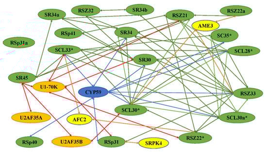 In addition to the action of more general splicing factors, SR proteins have been found to bind to more specific proteins, which are often regulated in a cell-, tissue-, or developmental-stage-specific, or stress manner. These proteins included novel proteins potentially involved in splicing regulation, kinases, CBC, C3H-type zinc finger protein, helicases, cyclins, and cyclophilins (Figure 2). The interactions of SR proteins with other proteins indicates that SR proteins play multiple functions or are regulated by different pathways. In plants, the interaction of SC35 and SCL proteins with NRPB4 has been observed. Flag-fused SCL28 and SCL30 were observed to co-immunoprecipate with YFP-fused NRPB4, but not with SCL30a, SCL33, or SC35, possibly due to weak interactions between themselves and NRPB4, suggesting they may have a function in the coordination of transcription and splicing [17]. Some studies have reported that kinases are involved in the interaction with SR proteins. For example, SRPK4, a member of a family of SRPK kinases in plants, interacted with RSp31 and other SR proteins, suggesting that SRPK4 is one of the kinases regulating SR protein function [3,22]. RSZ33 interacted with cyclin-dependent kinase G1 (CDKG1), through forming the nuclear speckles and residing in the same complex. CypRS64 interacts with a subset of Arabidopsis SR proteins, including SRp30 and SRp34/SR1. In addition, both cyclophilins interact with U1–70K and U11–35K, which in turn are binding partners of SRp34/SR1. AtCyp59 was identified as an interacting partner of the Arabidopsis SR protein SCL33/SR33 [16]. AtCyp59 dots have been found to localize on the periphery of speckles in which SR proteins are found. SR45a directly interacted with the CBC subunit cap-binding protein 20 (CBP20), which was originally identified through its role in pre-mRNA splicing and m7G-cap structure binding [23]. SR1, and other proteins including SRm102 and U1-70K, belonging to the components of the U1 spliceosome interacted with GDS1, which encodes a C3H42 protein, in the nuclear speckle compartments, suggesting that SR1 might play a significant role in splicing by forming spliceosome with other proteins [24]. The splicing factor SR34 colocalizes with SmD1, a component of the Smith (Sm) complex, in posttranscriptional gene silencing (PTGS) in nucleoplasmic speckles [25]. OsFKBP20-1b, belonging to the immunophilin family, interacted with OsSR45 in both nuclear speckles and cytoplasmic foci, and played an essential role in post-transcriptional regulation of abiotic stress response [26]. The SR protein interacted with highly ABA-induced 1 (HAI1) protein in nuclear speckle during drought stress [27]. The interaction network is presented in Table S2 [15,16,21,22,28,29,30,31,32,33,34,35,36,37,38,39,40,41,42,43,44,45,46,47,48,49,50].