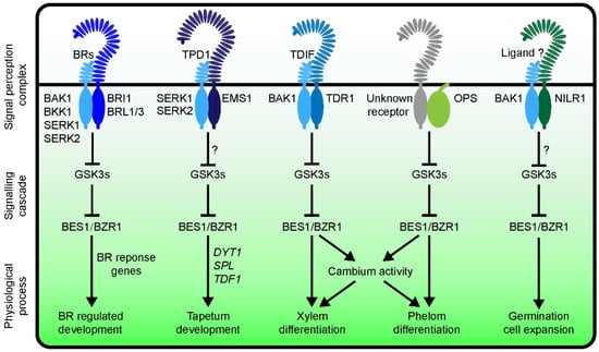 Ectopic expression of TPD1 and EMS1 simultaneously in bri1-116 leads to the accumulation of dephosphorylated BES1, similar to the outcome of BES1 upon the application of exogenous BRs [,]. More recently, EMS1 was found to interact with BSK1 and BSK3 []. It is likely that EMS1-TPD1-SERK1/SERK2 can regulate BES1 activity via the common downstream regulatory components of the BRI1-BR-BAK1 signaling cascade. Ultimately, activated BES1 can directly regulate the development of the tapetum by upregulating the expression of key genes such as DYT1, SPL, and TDF1 [,].