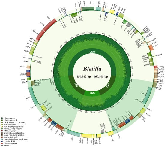 - Feng, H.; Cao, T.; Xu, H.; Liu, Y.; Han, Y.; Sun, W.; Liu, Y. Characterization of the complete chloroplast genome of Bletilla striata (Orchidaceae: Bletilla), the herb in China. Mitochondrial DNA B 2019, 4, 3542–3543. [Google Scholar] [CrossRef]