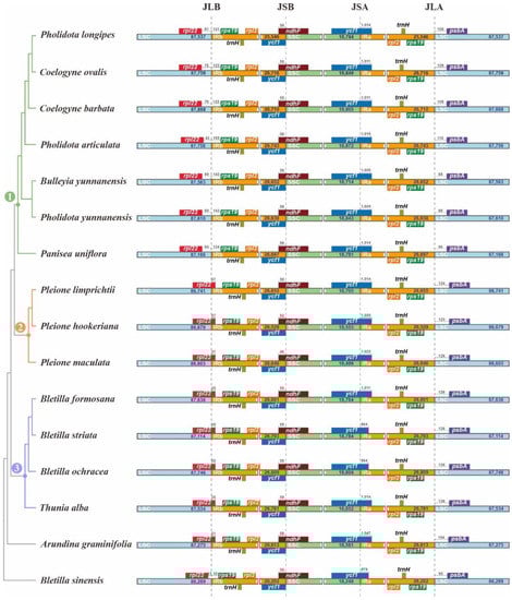 Contraction and expansion comparison of the junctions among 4 Bletilla plastomes. Blue, orange and green blocks represent the LSC, IR and SSC regions, respectively. Gene boxes represented above the block were transcribed clockwise and those represented below the block were transcribed clockwise. The base pairs (bp) number labeled within scale bars above the gene boxes indicate the extent of the integration between the junction region. The number 1, 2, and 3 above the branches represented different nodes, respectively.