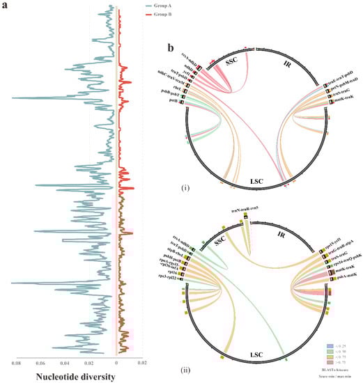 The HPR analyses among the plastomes of different groups. (a) The nucleotide diversity of the complete chloroplast genomes based on the comparison of group A (shown left the Y axis) and group B (shown right the Y axis), respectively. (b) The HPRs possessed by the two groups were shown in the Circoletto plot. The width of line reflected the region size, and the color is based on the BLASTn score: (i) group A; (ii) group B.