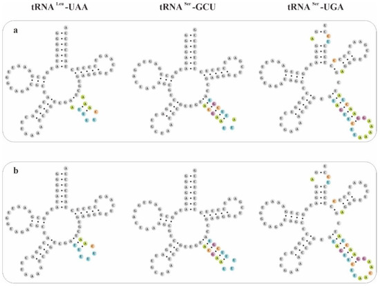- Sun, F.J.; Caetano-Anollés, G. The evolutionary significance of the long variable arm in transfer RNA. Complexity 2009, 14, 26–39. [Google Scholar] [CrossRef]