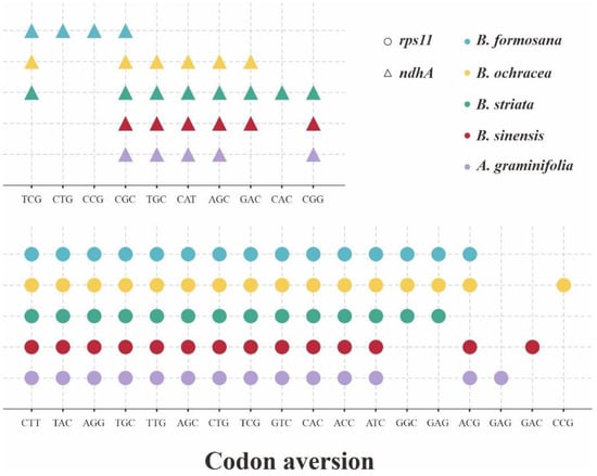 Considering the codon aversion can act as a new character system in phylogenetics, we also employed the analysis of CAM for these 53 CDSs of five plastomes (Table S2). The genus Bletilla had a highly conservative codon aversion pattern excluding B. sinensis, harboring the same motifs for 27 CDSs. Among these 27 CDSs, five are shared by B. sinensis (clpP, ndhB, ndhJ, rps7 and ycf4). Surprisingly, we detected many unique CAM for B. sinensis from a total of 31 CDSs, indicating the substantial interspecific difference in Bletilla. Furthermore, two CDSs (accD and atpF) were observed that were shared by A. graminifolia and B. sinensis. Most significantly, as shown in Figure 6, the aversion motifs identified in ndhA and rps11 genes could distinguish five investigated species.