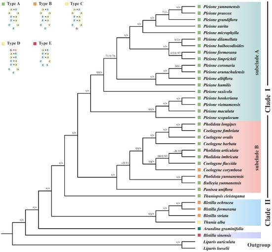As Figure 7 displayed, most Arethuseae species formed two main clades. Clade I comprised 6 genera, which could be further divided into two subclades. All Pleione species clustered in a strongly supported monophyletic group (subclade A) ([BS] = 100, [PP] = 1.0). As sister to subclade A, subclade B consisted of four genera (Pholidota, Coelogyne, Panisea and Bulleyia ([BS] = 100, [PP] = 1.0). Among the members of subclade B, the two genera (Pholidota and Coelogyne) were recovered to be paraphyletic. Thuniopsis, a monotypic genus, was found to be the basal sister branch of Clade I ([BS] = 100, [PP] = 1.0). Furthermore, Bletilla species (excluded B. sinensis) and Thunia alba formed a distinct clade (clade II) (90 in ML, 1.0 in BI). Our data also support a sister relationship between Arundina graminifolia and these two main clades (clade I and II).