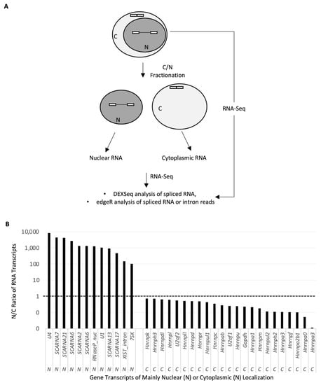 The nuclear RNA fraction was highly enriched with known nuclear RNA transcripts by edgeR analysis of their relative levels over those in the cytoplasmic fractions (Figure 1). In particular, the U4 and U1 snRNAs, Small Cajal body-specific RNAs ScaRNA2, 6, 7, 13, 17, and 21, RNase-P nuclear RNA, Xist-intron RNA, and 7SK RNA were about 100 to 10,000 times enriched, consistent with their nuclear localization [,,,,]. In contrast, the spliced mRNA transcripts of the Hnrnp, U2af, and Gapdh genes all had an N/C ratio of less than 1, consistent with their mainly cytoplasmic localization. This verified the specificity of the nuclear RNA samples by our nucleo-cytoplasmic RNA fractionation method.