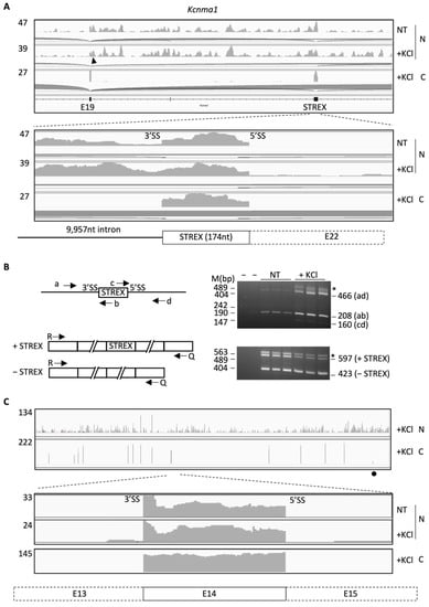Manual examination of the STREX exon and its flanking introns in the integrated genomics viewer (IGV []) identified intron reads at its upstream 3′ but not downstream 5′ splice site (SS) in the nuclear RNA-Seq samples (Figure 2A, non-treated, NT). Upon KCl-treatment (50 mM), the 3′SS read abundance (relative to the 5′ end of the exon) increased from about 30% to 67% on average (p < 0.001, hypergeometric density test) with little increase at the downstream 5′SS. The prominent increase of the upstream 3′SS reads is consistent with its increase in RT-PCR from the pre-mRNA at about five times over that of the downstream 5′SS (Note: band intensity normalized with product lengths, p < 0.01, Figure 2B), and is in contrast to the decreased STREX usage in the KCl-treated samples (from 31% to 21% on average, p < 0.005) similarly as in previous reports [,,]. There were neither such reads in the cytoplasmic samples where the STREX exon reads were abundant (Figure 2A) nor the comparable level of reads around the constitutive exon 14 in the nuclear samples (Figure 2C). Moreover, the 5′ splice site in the upstream intron of STREX accumulated reads as well in the nuclear RNA samples (Figure 2A). Thus, splicing of the STREX upstream intron was specifically inhibited in some pre-mRNA transcripts in the NT and further in the KCl-treated nuclear RNA samples. This is consistent with the inhibition of the upstream 3′ splice site by depolarization and calcium signaling in minigene splicing reporter assays [,,] and supports mainly delayed intron rather than exon definition in the depolarization-regulation of the STREX exon.