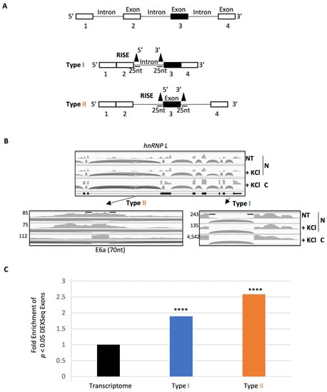 Further manual examination of a group of RISE-containing splice sites of cassette exons in the IGV identified three types of such reads (Figure 3A): in the same intron (type I), across the same exon (type II), or neither type I nor II (III). We reckoned that type III perhaps was a variation of the first two in more complex situations such as pairing with farther away splice sites. Therefore, we focused on types I and II in this study. For example, for the alternative exon 6a of the hnRNP L gene [], it has high levels of type II RISE across the exon in the nuclei, compared to that in the cytoplasm (Figure 3B). A pair of type I RISE is also visible in the last intron in the NT nuclear RNA with little change by depolarization, unlike the STREX (Figure 2).