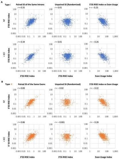 Interestingly, the paired RISE indexes overall correlated positively between the 5′SS and 3′SS across introns in the NT sample (Figure 4A, type I, Upper Left), in comparison with their unpaired SS (randomized, Figure 4A, Upper Middle). In contrast, the 5′SS RISE index inversely correlated with the usage of adjacent exons (Figure 4A, Upper Right) and so was the 3′SS RISE index (r = −0.18). Furthermore, similar correlation patterns were also observed in the KCl-treated samples (Figure 4A, Lower panel).