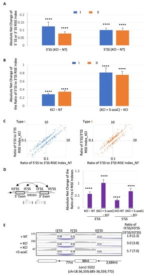 We also examined the depolarization effect on the shift of RISE indexes between type I and II pairs by measuring their ratio changes between competing splice sites (Figure 5D), as expected in the shift between exon and intron definitions [,]. On average, the ratio of the competing 3′ or 5′SS RISE indexes was significantly shifted by depolarization and further by 5-azaC, as measured by the absolute net changes. For example, the ratio of the RISE indexes across the Lars1 exon E022 was increased by depolarization and further by 5-azaC; as is the ratio between the competing 3′SS (Figure 5E). This is consistent with a shift from type II to type I RISE pairing, i.e., from delayed exon to intron definition.