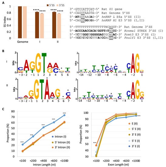 Properties of the RISE-associated splice sites, exons, and introns. (A) Indexes of the nucleotide matrices of the involved splice sites. Left: bar graphs of the splice site indexes of the most abundant nucleotides of the consensus splice sites of Rattus norvegicus (index = 1, Ref. [], Nguyen and Xie, Gene’18, using Ensembl Genome Metazoa Release 96), and the RISE-associated splice sites (−3–+10 for the 5′SS, and −20–+2 for the 3′SS, Mean ± SEM, n = 186,851, 188,528, 67, 44, 48, 48 splice sites, from left to right). ****: p < 0.0001, one sample t-test compared to the genome. Right: examples of the RISE-associated 5′ or 3′SS sequences. For the 5′SS, the genome consensus matches perfectly with the complementary consensus region of 81 U1 snRNA sequences from rats. Nucleotides different from the genome consensus are in bold and the 5′ GT and 3′ AG are underlined. Bracketed are the associated types of RISE pairings. (B) Logo representation of the information content of the enriched nucleotides of the 5′ (Left) and 3′ (Right) splice sites with either type of the RISE pairing and DEXSeq p < 0.05, in comparison with the SS consensus sequences of the rat genome in (A) (Right panel). n = 28 (I, 5′SS), 50 (I, 3′SS), 34 (II, 5′SS), 34 (II, 3′SS) splice sites, and E-value < 1.3 × 10−28 and 5.6 × 10−42, for the 5′ and 3′SS, respectively. *: nucleotides deviated from the species consensus. (C) Percent distribution of intron/exon lengths. Left: intron length distribution. ***: p < 6.7 × 10−10, hypergeometric density test compared to either 5′ or 3′ introns of the exons flanked by type II RISE pairings. Right panel: similarly as in the left, but for exon lengths. ***: p < 4.3 × 10−6, E (II) in comparison with the 5′ or 3′ E (I). E: exon. n = 644 or 311 introns/exons, for each type I or II data point (non-overlapping), respectively.